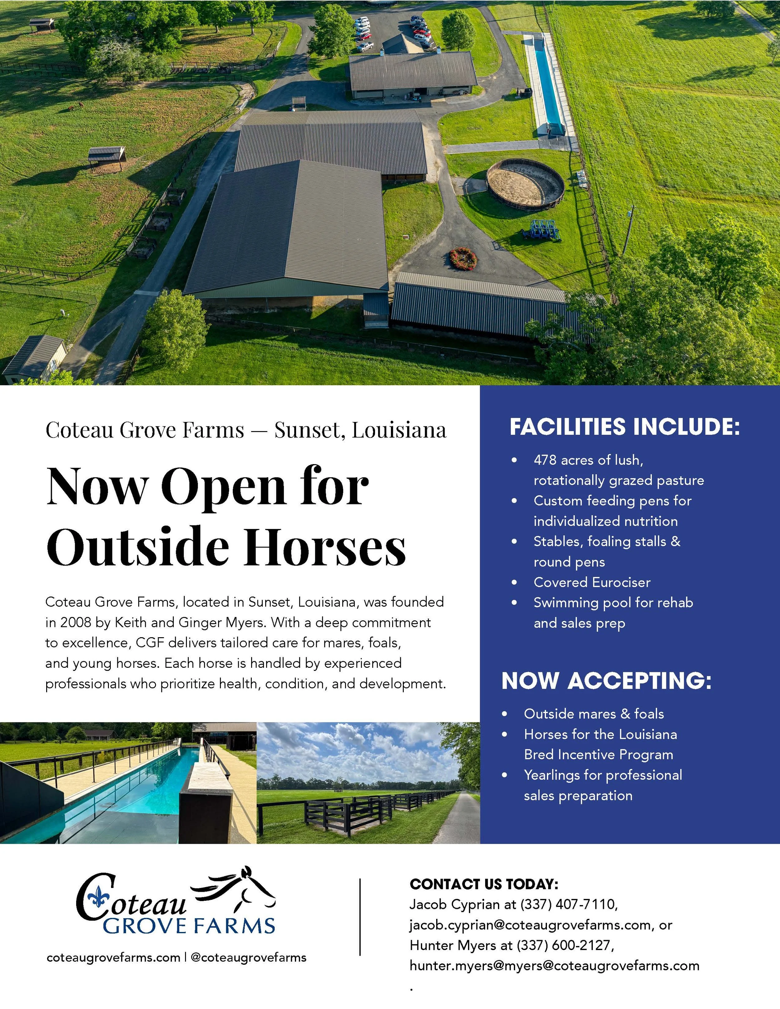 Sunset, La. - Coteau Grove Farms, a leading equine care center in the region, announced Monday that it is now accepting horses for boarding, foaling services, equine rehabilitation and conditioning, and sales preparation. The facility is recognized for its exceptional land, state-of-the-art facilities, ample turnout, and a disciplined, horse-first approach, making it a premier destination for equine care and development in the area.